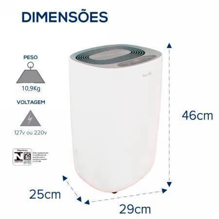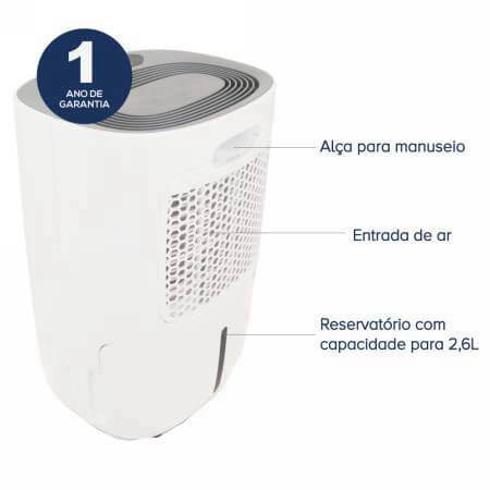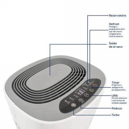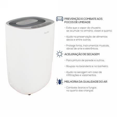 Desumidificador elétrico silencioso e moderno, possui umidostato digital, possibilidade de drenagem contínua e pá direcionadora de ar (swing).